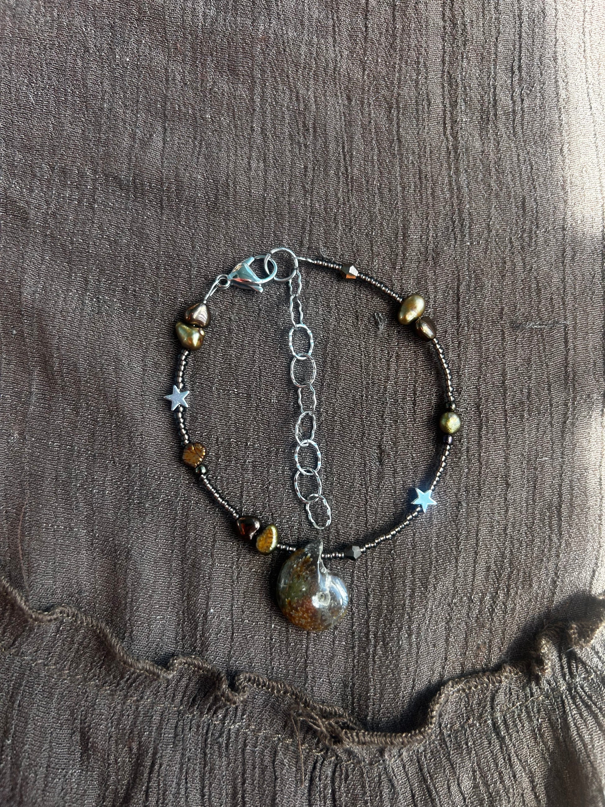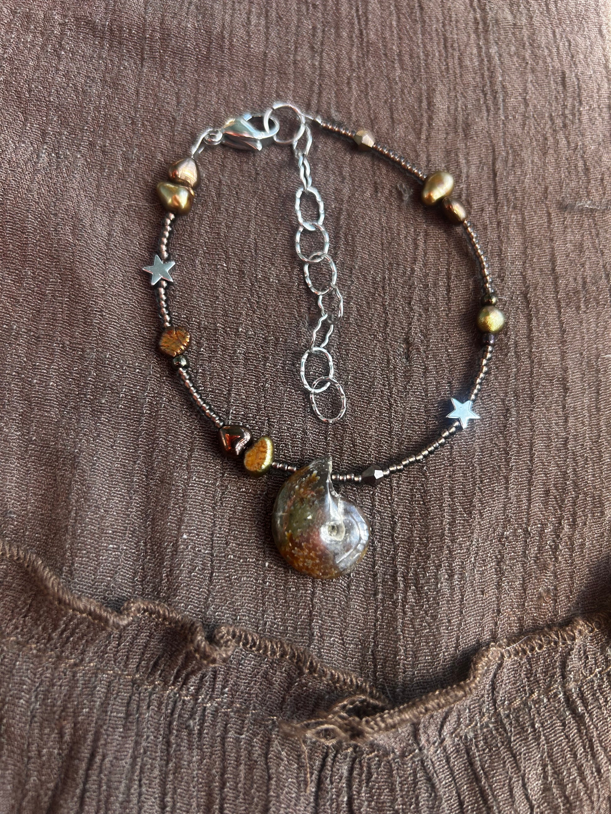 Anklet made by me with czech glass, freshwater pearls, stainless steel, and a genuine ammonite pendant/charm. 8” extends to 10.5”