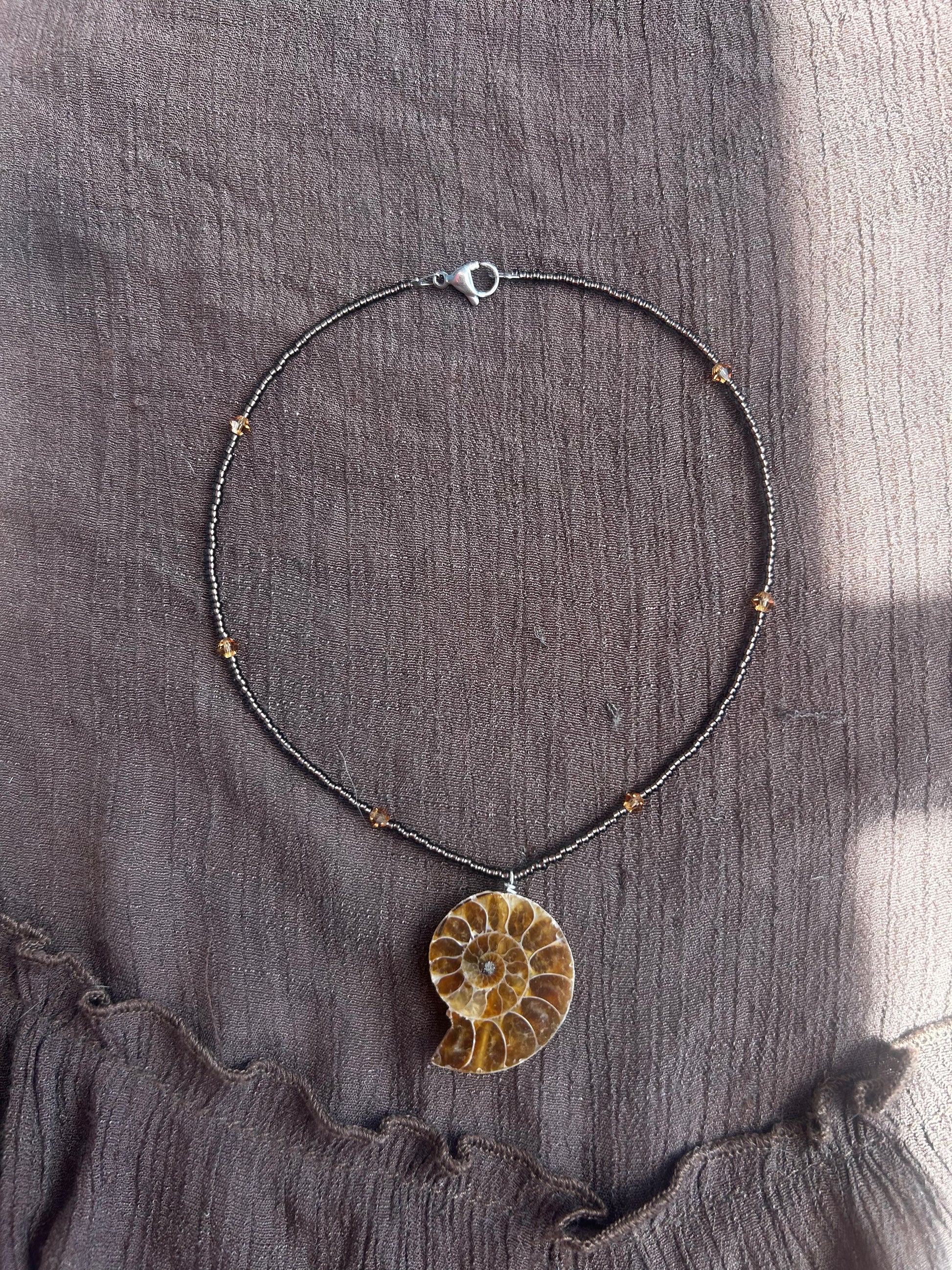Choker made by me with czech glass, stainless steel, and a genuine ammonite pendant. 14” can add length upon request after purchase.