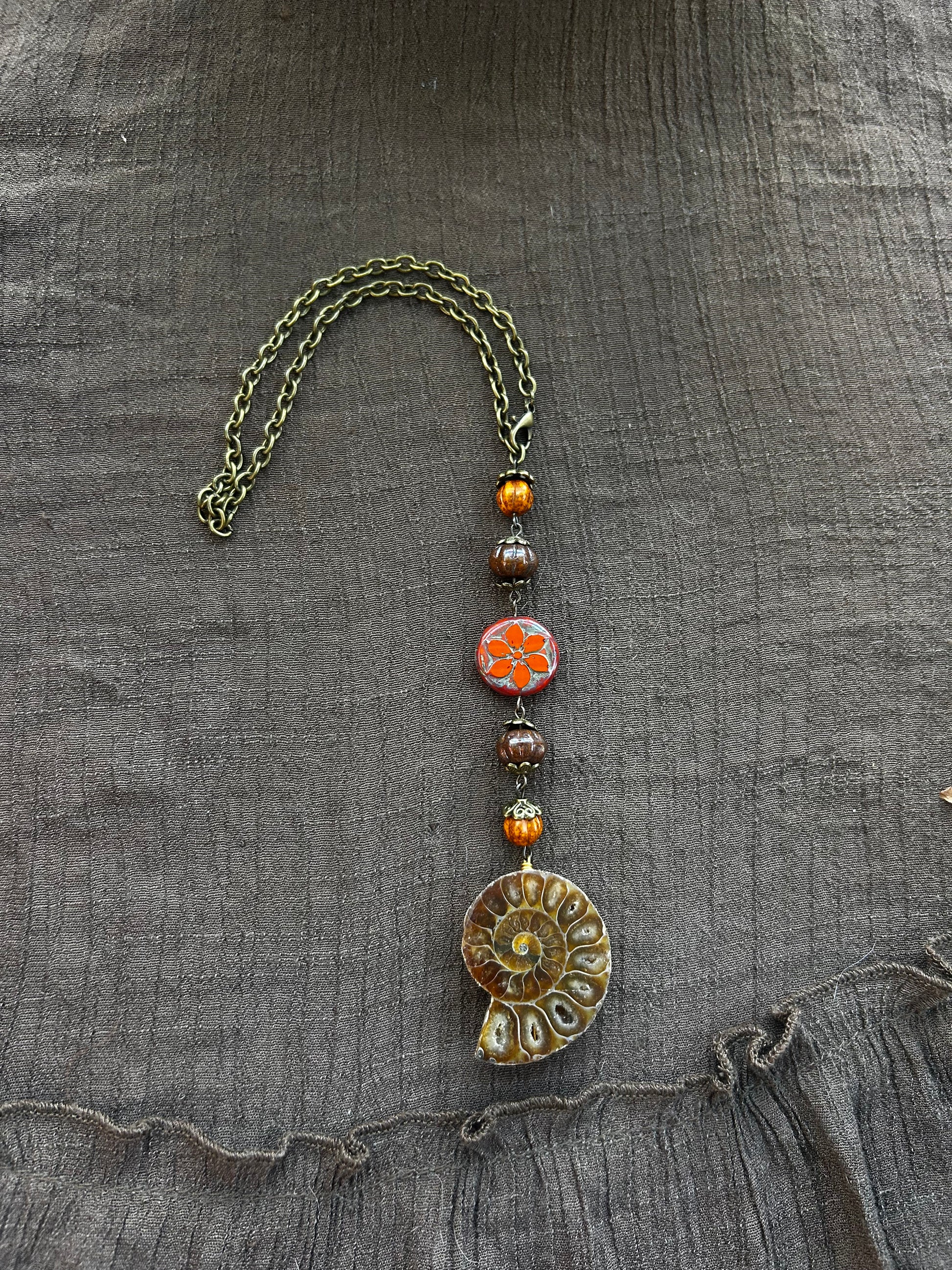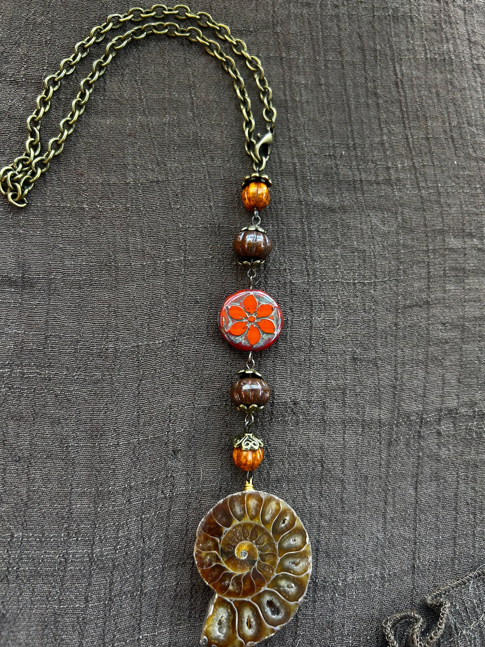made by me with a genuine ammonite, antique brass, and assorted beads. 5” long. preferably, after purchase, you will send me the circumference of the part you will be hanging it on so I can adjust it perfectly.