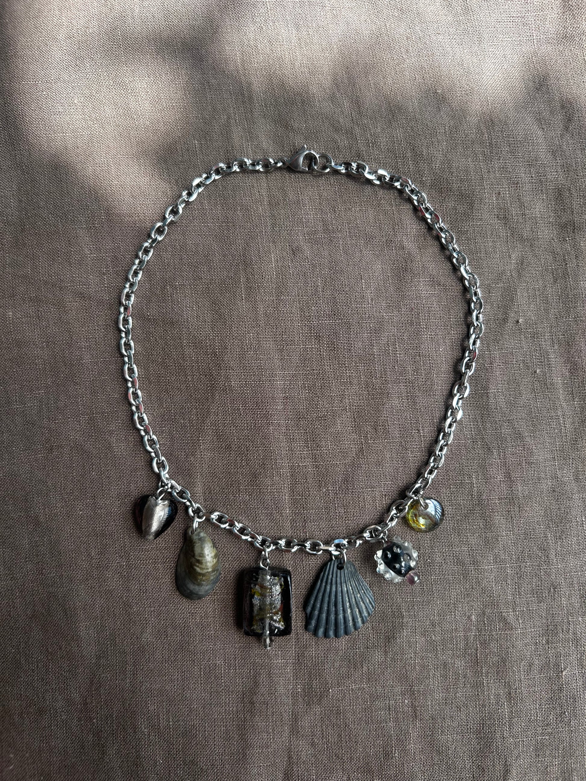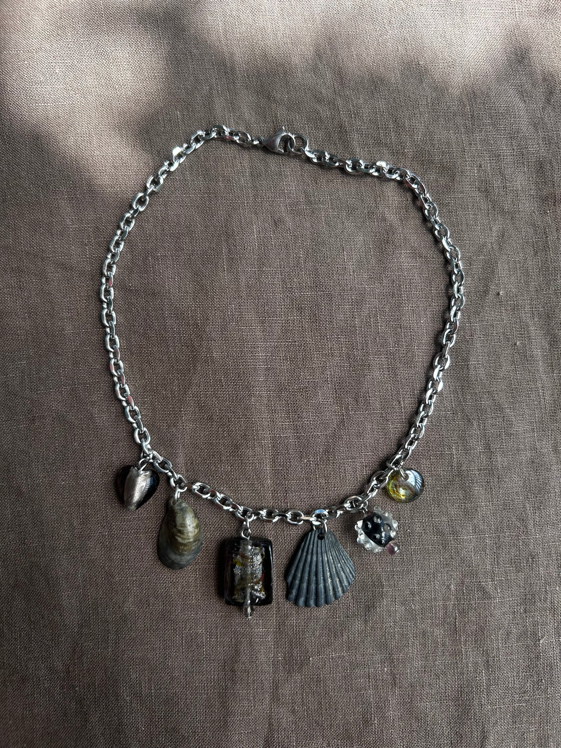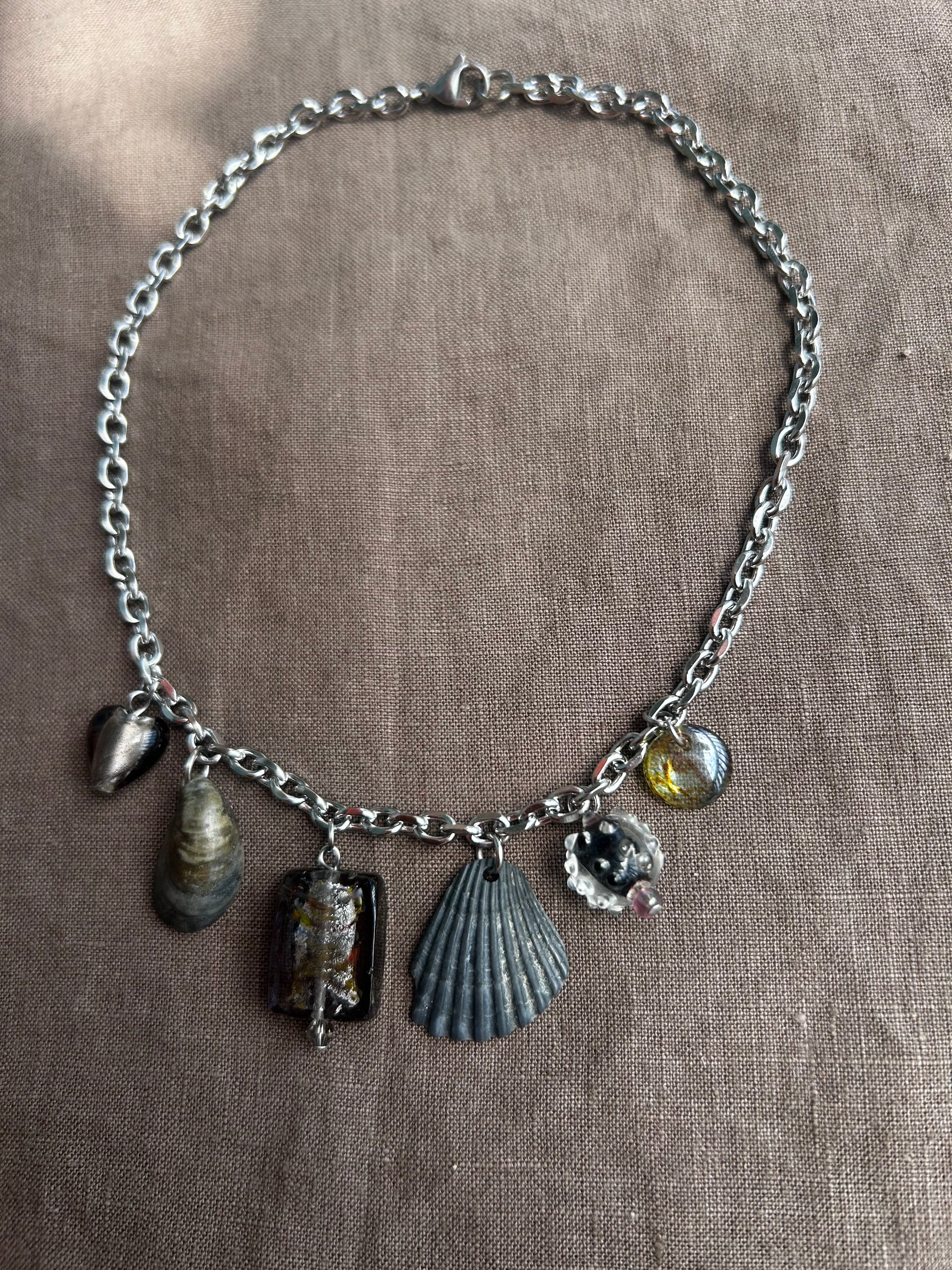 Necklace made by me with stainless steel chain, assorted beads, and 2 shells found and drilled by me plus reinforced with resin. 14 1/2 I can add length upon request after purchase.