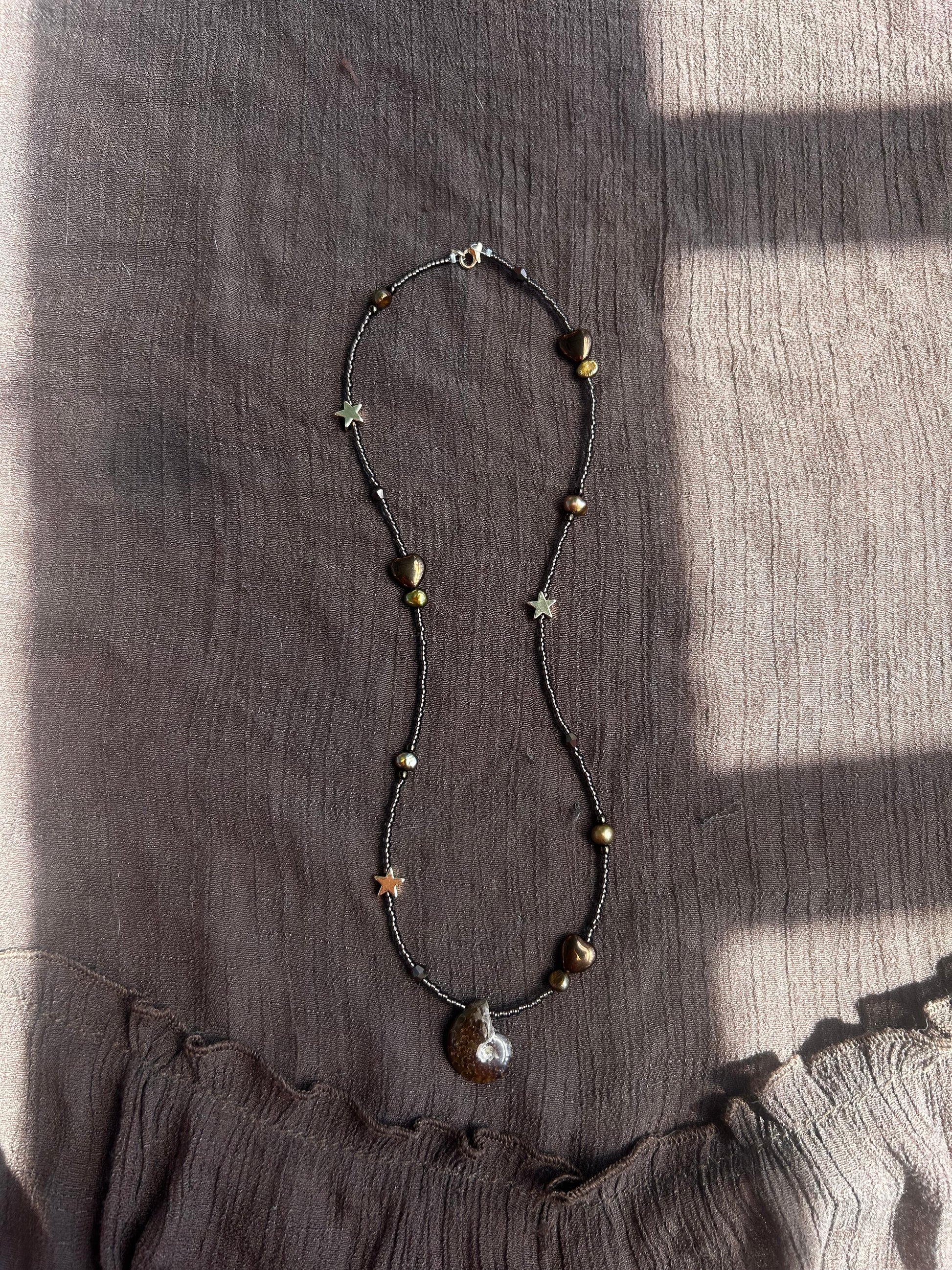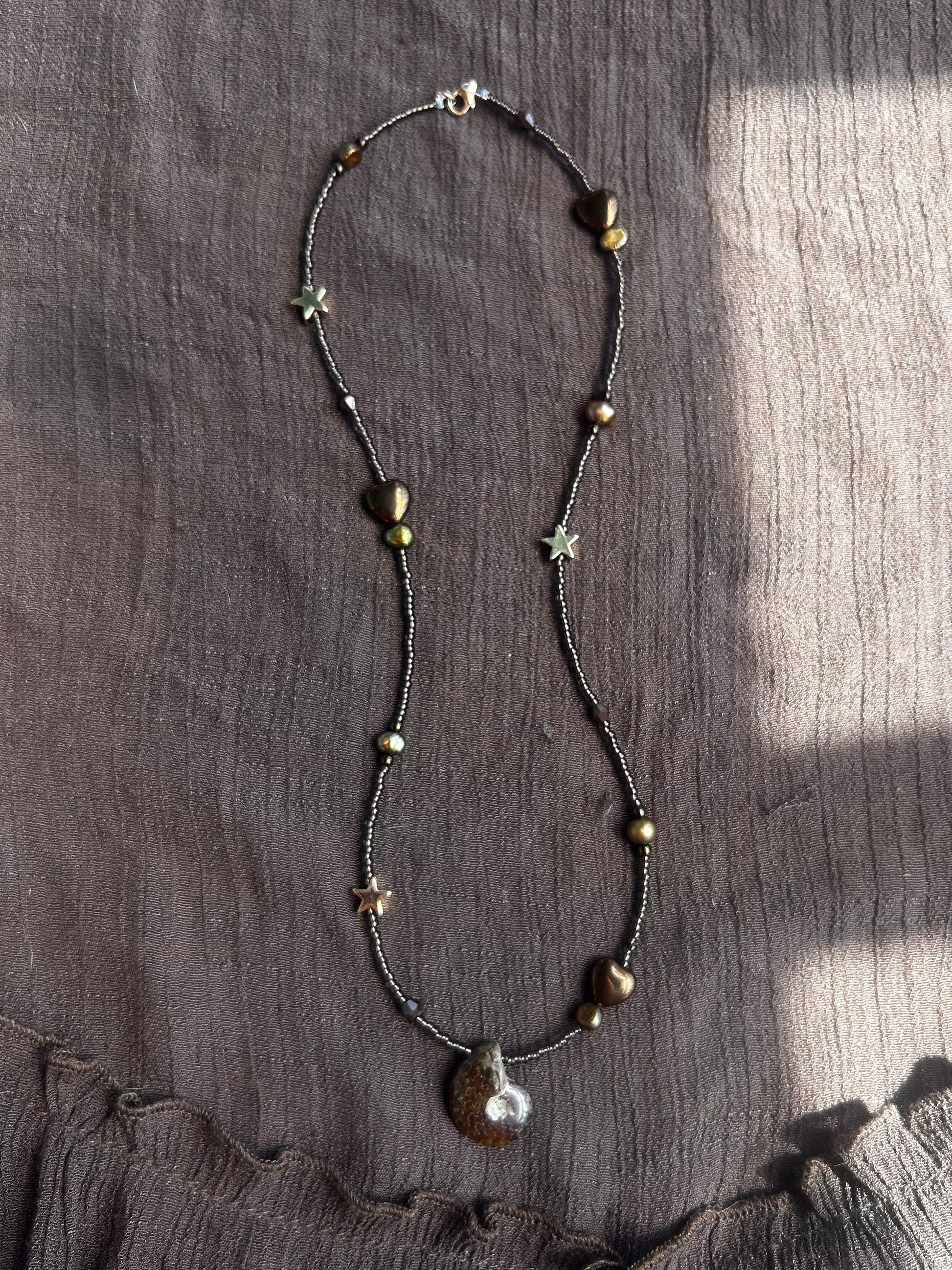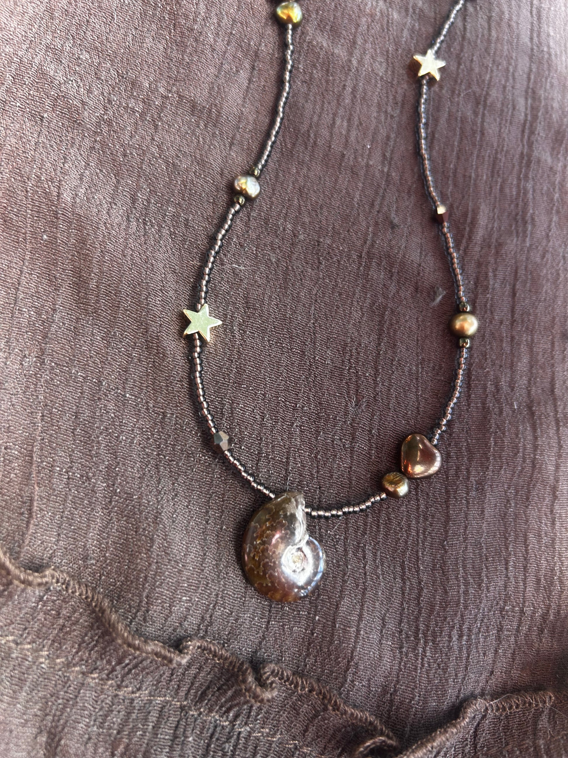Necklace made by me with czech glass, freshwater pearls, 14k gold filled stars and clasp, and a genuine ammonite pendant. 19.5”