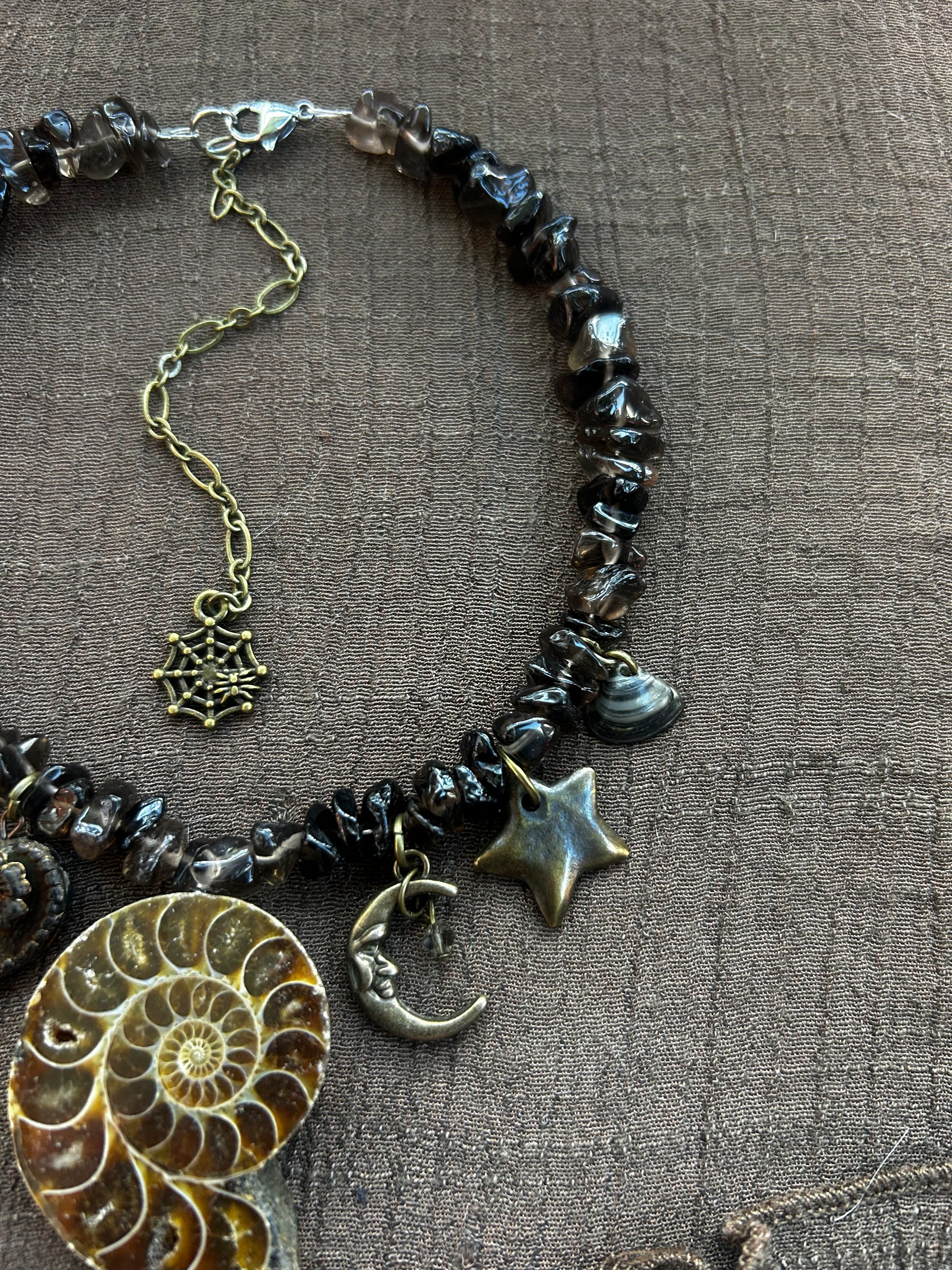 Choker made by me with smokey quartz, a genuine ammonite pendant, seashells found and drilled by me, czech glass, antique brass charms, and a stainless steel clasp. 12” extends to 16”