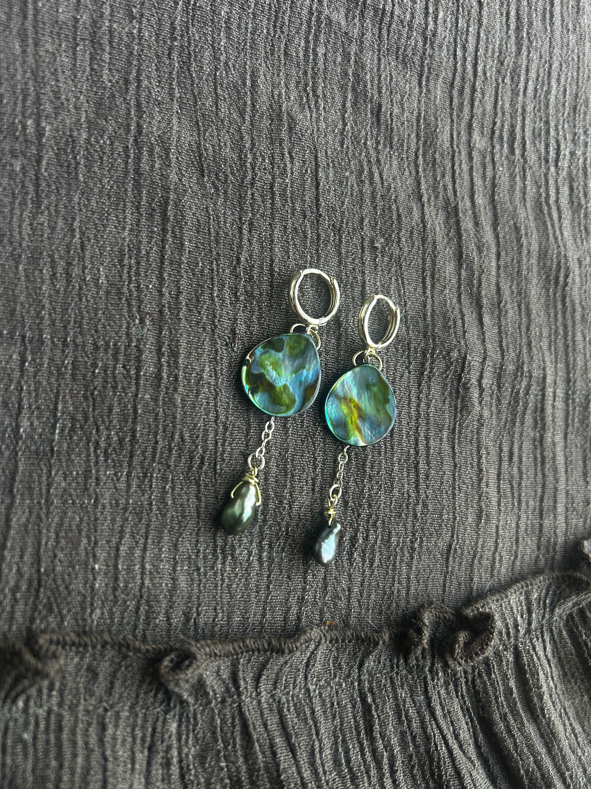 Earrings made by me with with 14k gold filled 12mm hoops and chain, green freshwater pearls and abalone. Lightweight.