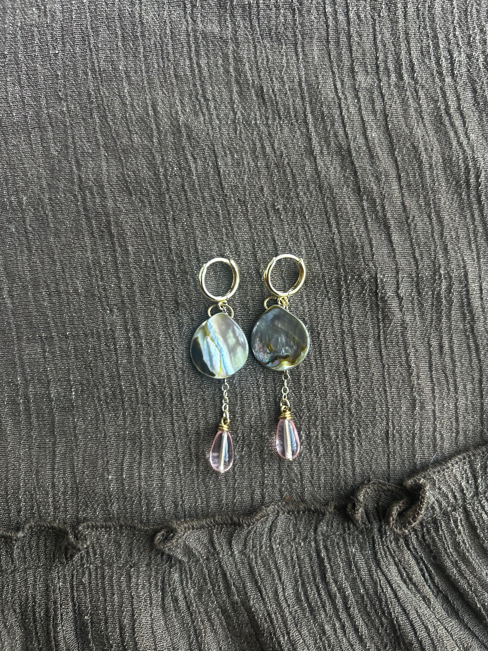 Earrings made by me with 14k gold filled 12mm hoops and chain, and abalone. Lightweight