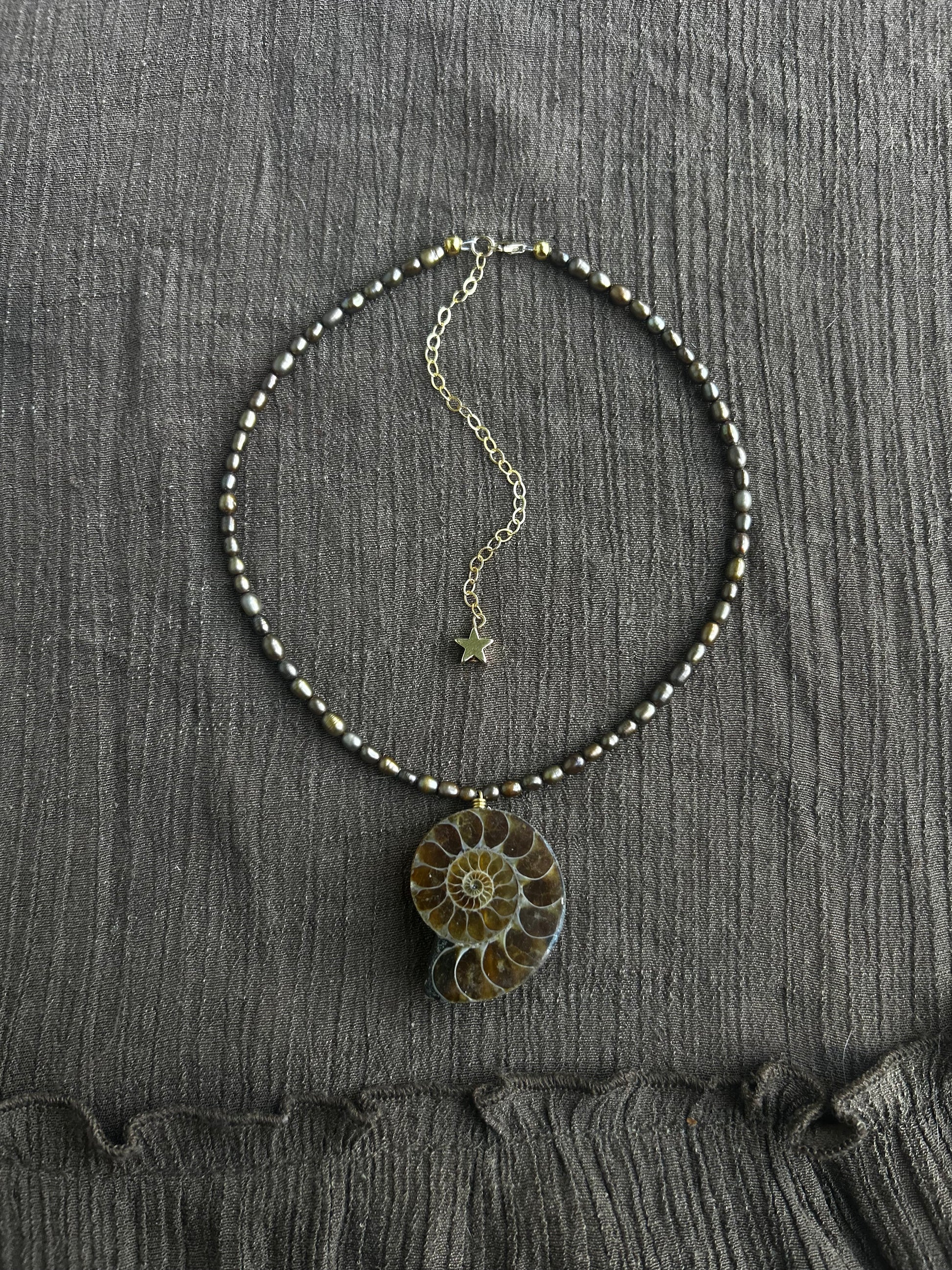Necklace made by me with second hand pearls, 14k gold filled clasp, chain, and star, and a genuine ammonite pendant (1.5”). 13.25” extends to 17”