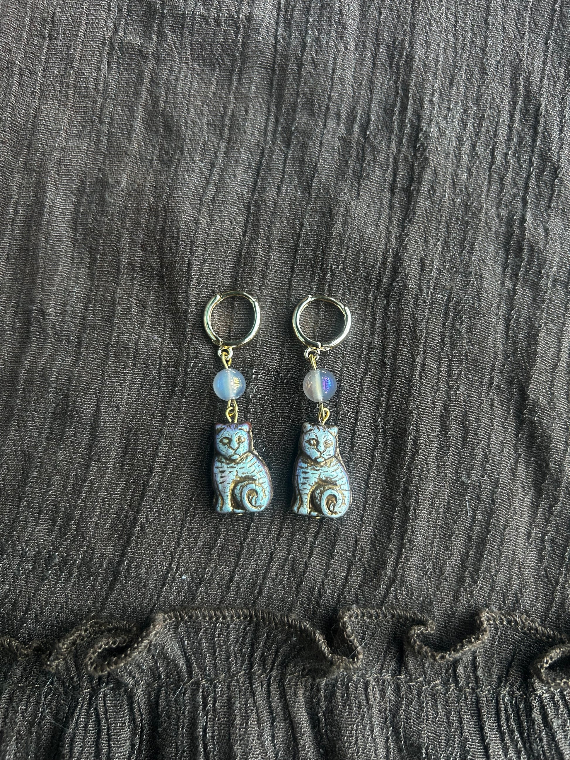 Earrings made by me with iridescent beads, czech glass cat beads, gold stainless steel, and 14k gold filled huggie hoops.