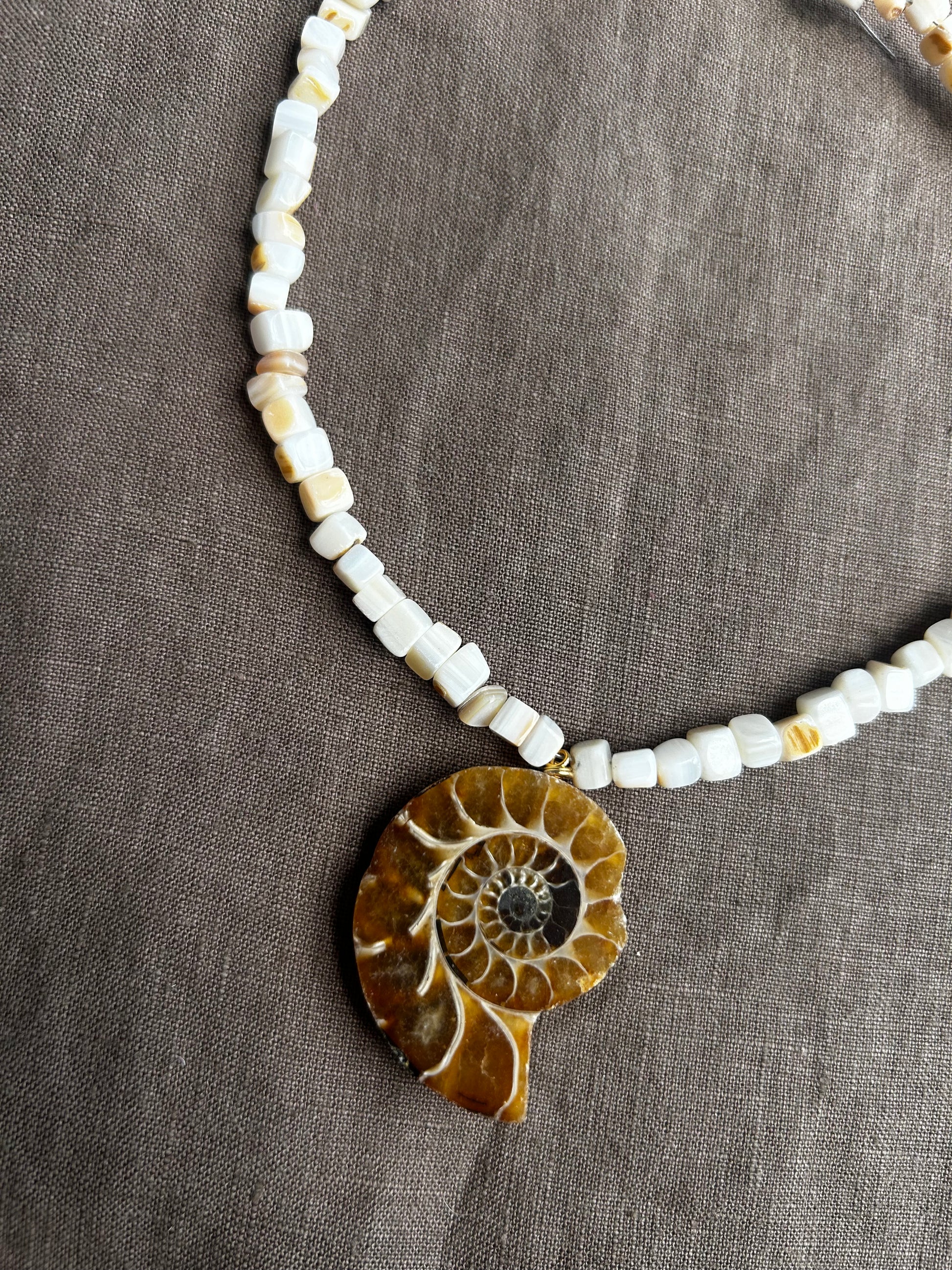 Choker handmade by me with nacre beads, an ammonite pendant, and a 14k gold filled clasp. I can add an extension chain upon request after purchase (will be a $5 add on)