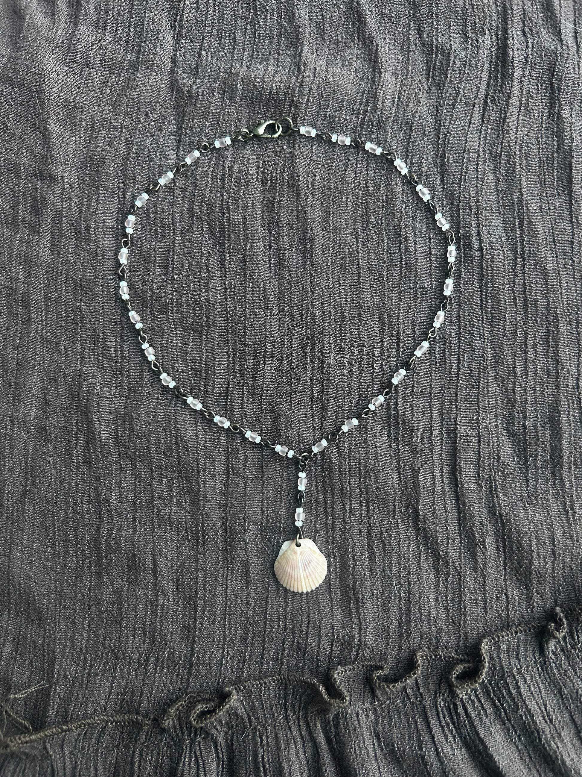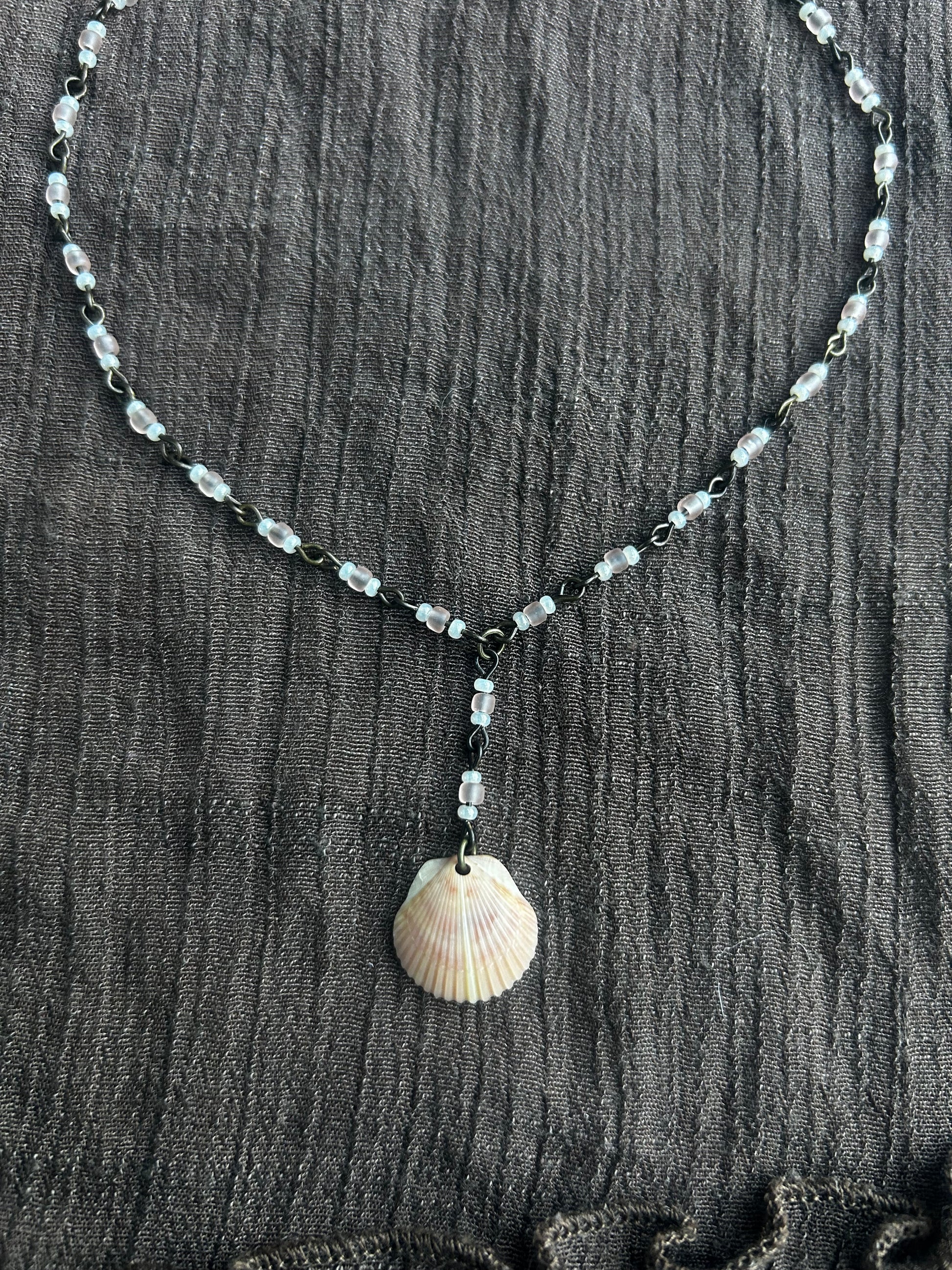 choker handmade by me with antique brass, pink and brown seed beads, and a scallop shell found and drilled by me. 13.5”