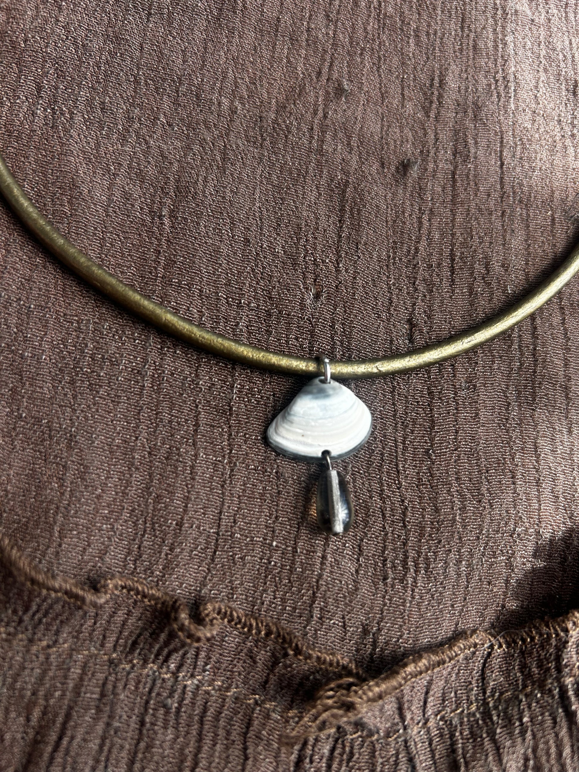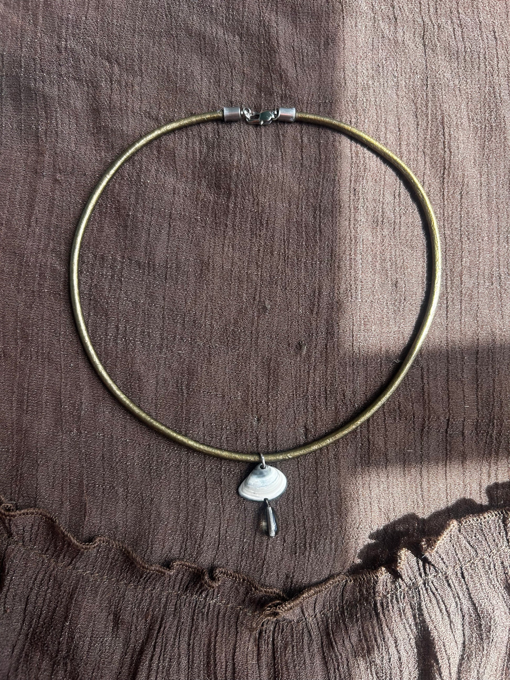 Necklace made by me with leather chord, stainless steel, a glass bead, and a seashell found and drilled by me plus reinforced with resin. 16”