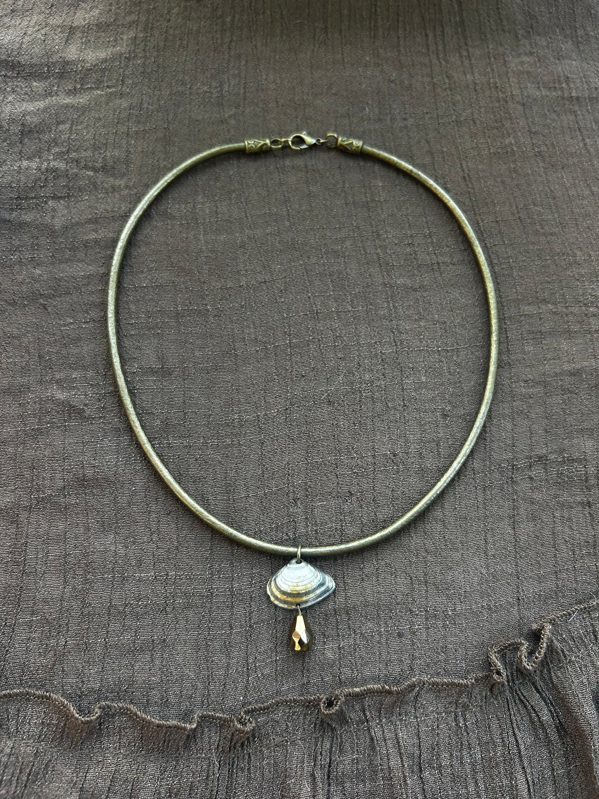 Necklace made by me with a seashell found and drilled by me plus reinforced with resin, czech glass, antique brass charms, and leather cord. 16.5”