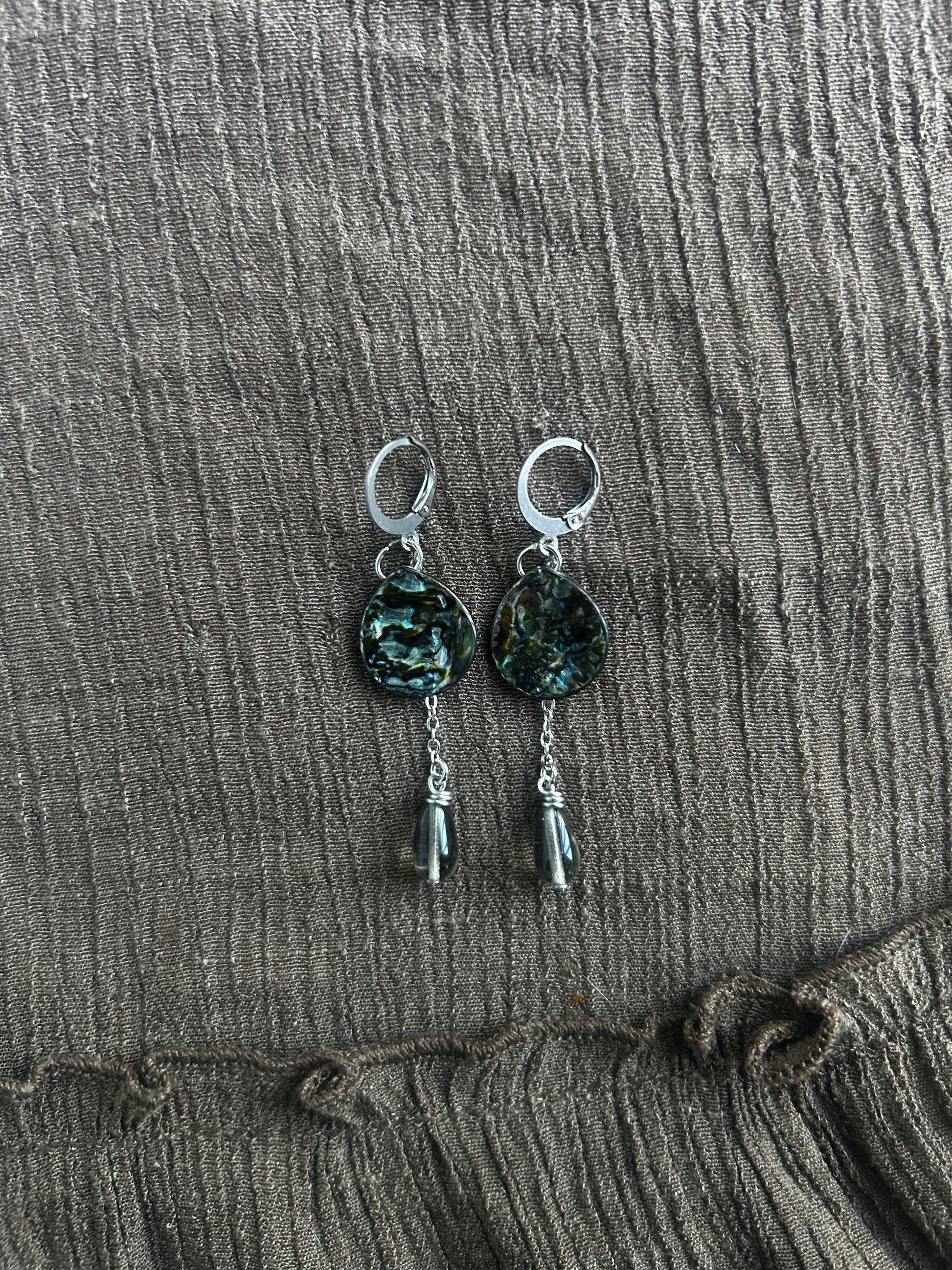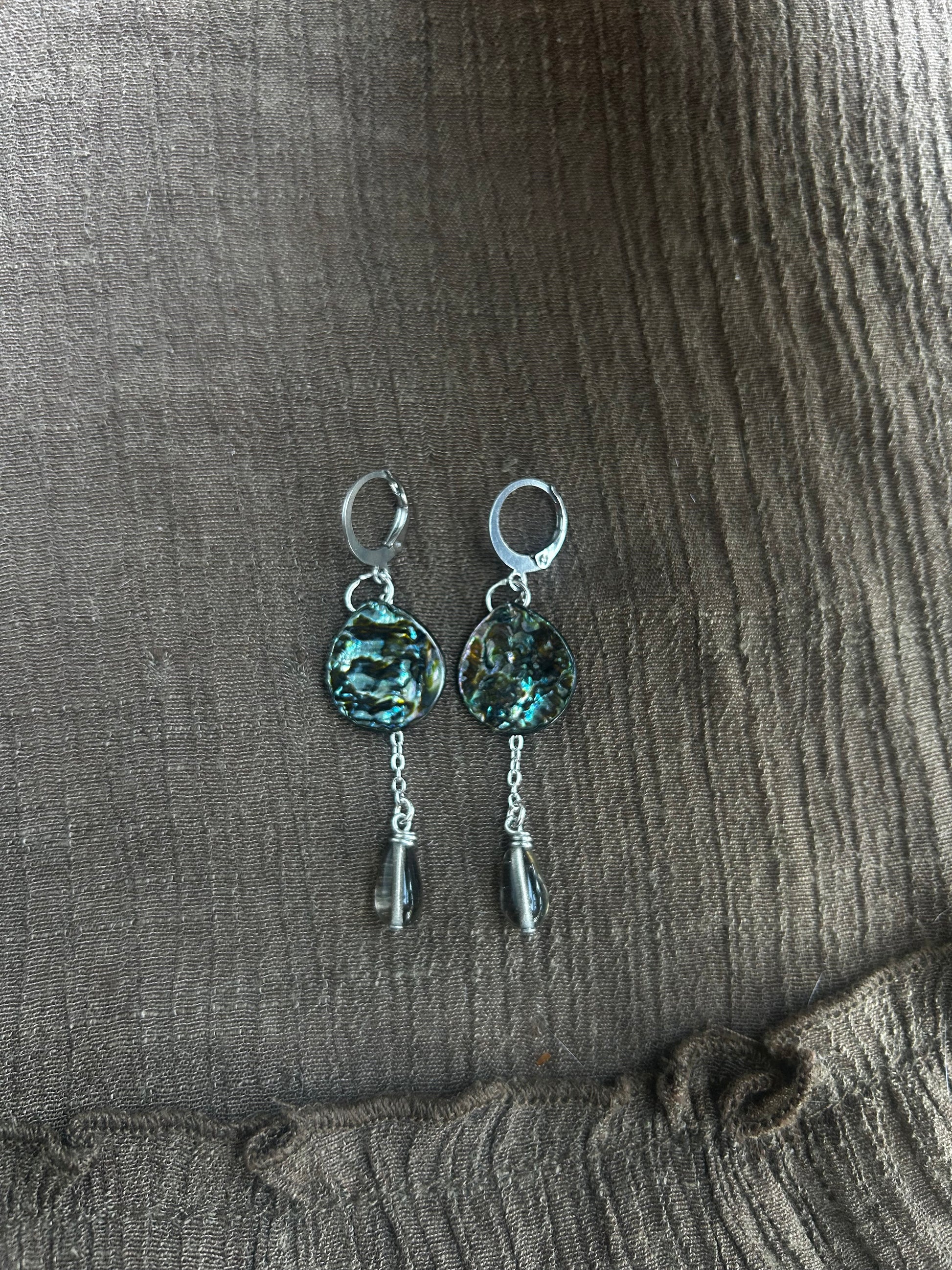 Earrings made by me with stainless steel, abalone, and grey glass beads. lightweight