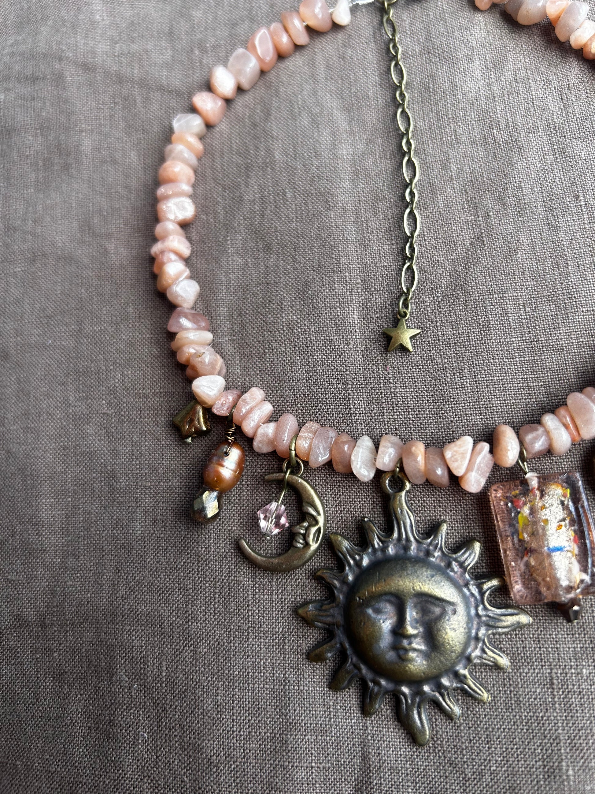 Choker made by me with sunstone as the base, bronze colored beads, czech glass, a freshwater pearl, antique brass moon with czech glass, an antique brass sun pendant, and an antique brass clasp and chain. 12 1/2” extends to 15 1/2”