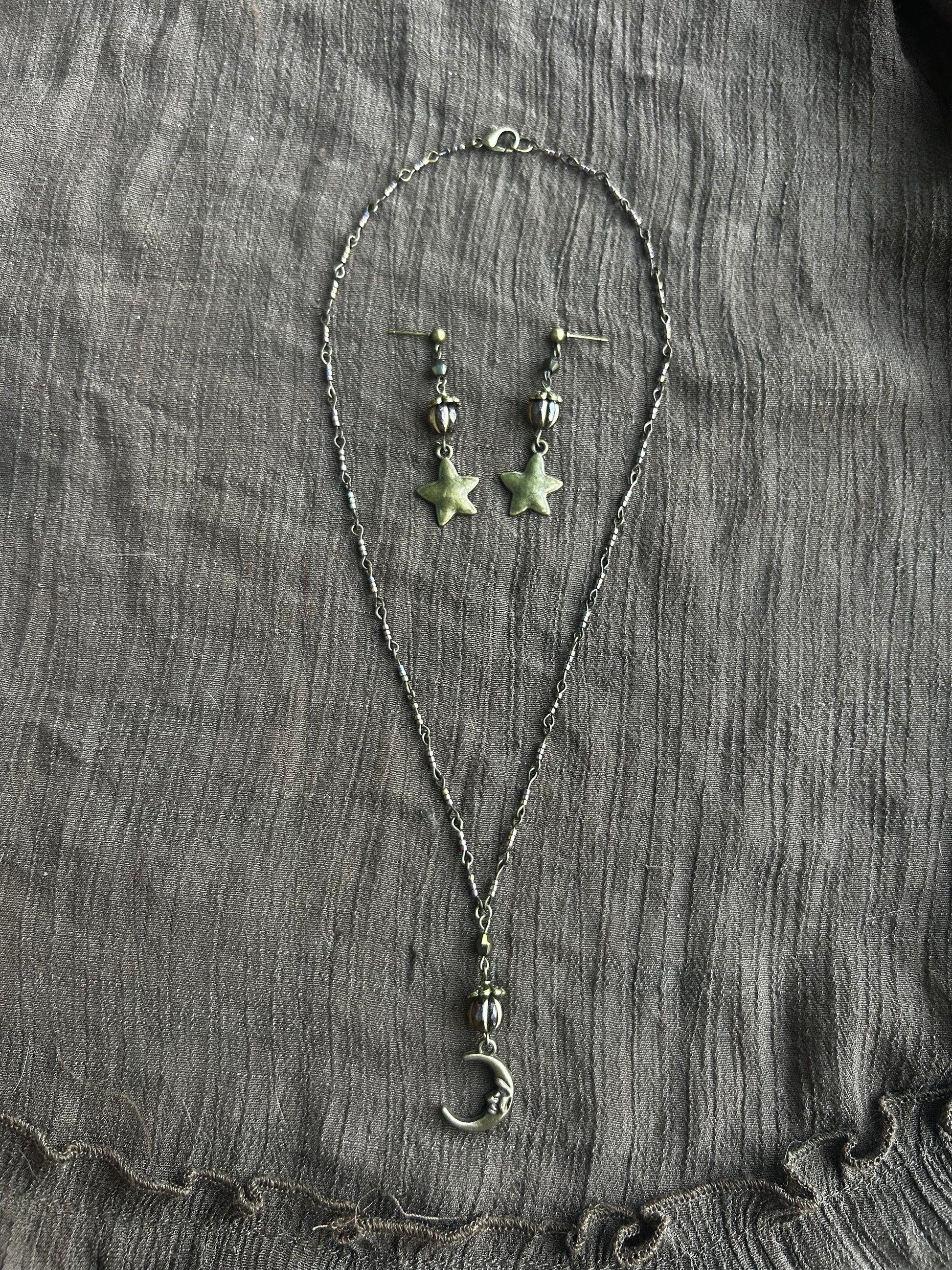 Necklace and earrings set made by me with antique brass and czech glass. necklace is 16” earrings are lightweight
