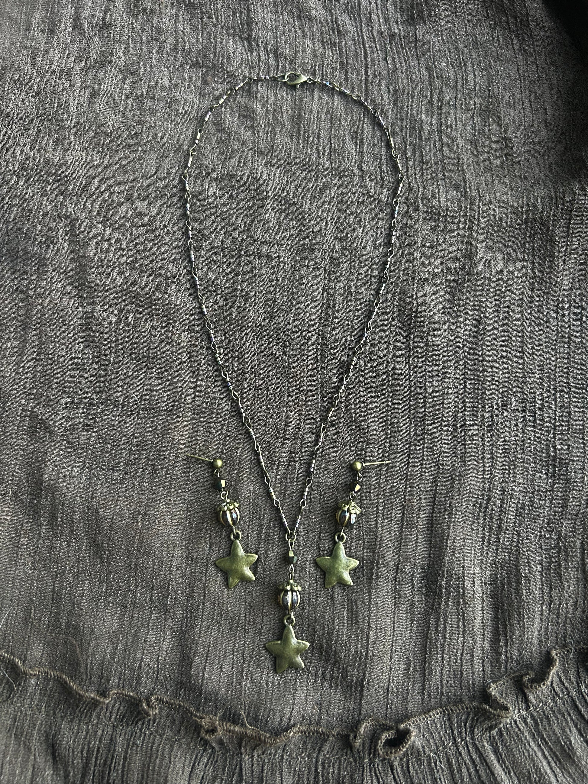 Necklace and earrings set handmade by me with czech glass and antique brass. necklace is 16” earrings are lightweight.